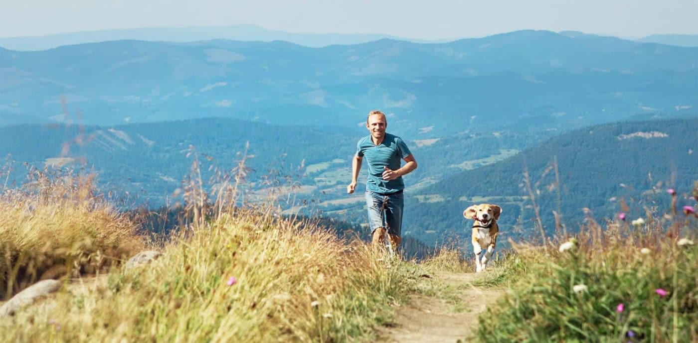 young woman in a hat with dog Shar Pei sitting in the field and looking to the river in golden sunset light