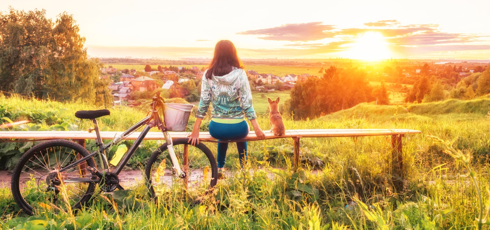 A girl and a dog are looking at a beautiful sunset on the horizon
