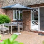 Der ruhige Garten mit Terrasse ist mit Gartenmöbeln und einem Strandkorb ausgestattet und von einem Friesenwall umgeben.