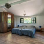 Auf verschiedenen Ebenen befinden sich innerhalb des Hauses im oberen Bereich vier Schlafzimmer: zwei Schlafräume mit Doppelbetten und jeweils separaten Duschen, ein Schlafraum mit zwei Einzelbetten und separatem Waschraum, ein Schlafraum mit drei Einzelbetten, daneben das Bad mit Wanne, Waschbecken, Bidet und Toilette. Ein weiteres Bett steht noch zur Verfügung. Für Familien mit Kleinkindern gibt es zusätzlich ein Kinderbett.