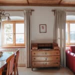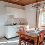 Liebevolle mit Bauernmöbeln eingerichtete Ferienwohnung, welche über ein Schlafzimmer mit originalen Bauernmöbeln verfügt, einen Vorraum mit einem Stockbett, ein großzügiges Badezimmer und einen Wohn- Essraum, mit Kochnische mit Geschirrspüler (ist nur in dieser Wohnung), Essbereich mit Kaminofen und gemütlicher Couch