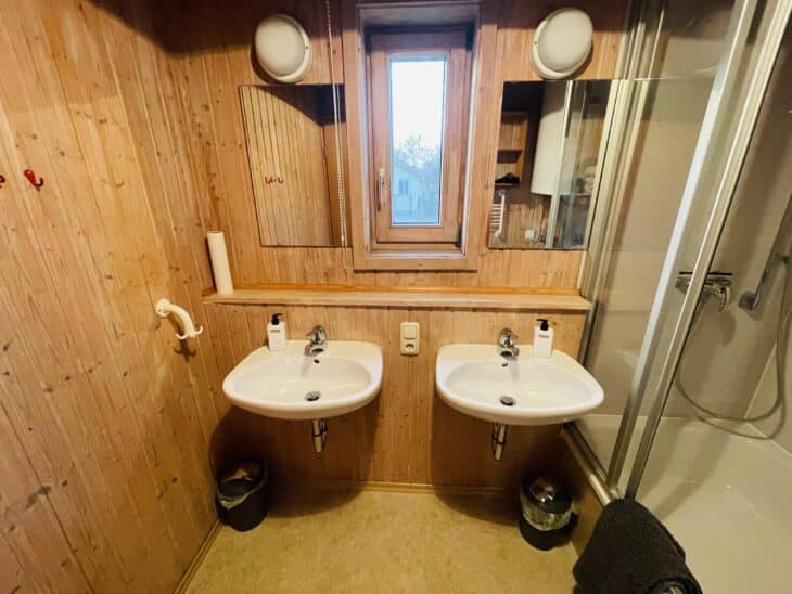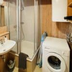 Das Badezimmer bietet Ihnen zwei Waschbecken, eine Dusche, und eine Waschmaschine. Zusätzlich gibt es ein separates WC mit eigenem Waschbecken.