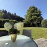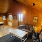 Hier finden Sie eine bequeme Couch, eine gemütliche Sitzecke und einen Esstisch mit Platz für 4 Personen. Die Glastür führt direkt auf die möblierte Terrasse und in den Garten – perfekt für entspannte Stunden im Freien.