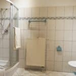 Das Bad ist ausgestattet mit WC, Dusche, Föhn und Handtücher.