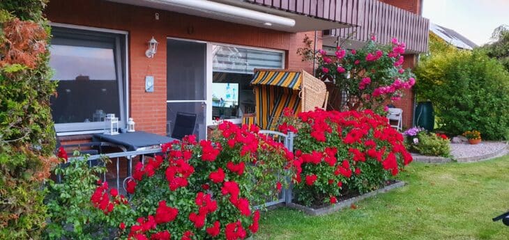 Unsere Ferienwohnung "Möwennest" liegt im Erdgeschoss (ohne Treppen), hat einen separatem Eingang und eine große eingezäunte Terrasse mit elektrischer Markise und einem gemütlichem Strandkorb für schöne Stunden zu Zweit.