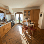Das Haus erstreckt sich über zwei Etagen. Im Erdgeschoss befinden sich ein großzügiges Wohnzimmer mit Ofen und Holztisch, eine separate, voll ausgestattete Küche sowie ein Badezimmer. Über eine Holztreppe gelangt man ins Obergeschoss mit drei hellen Doppelzimmern, die dieses Jahr komplett renoviert wurden, sowie einem weiteren Badezimmer.