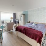 Von hier aus gelangt man auch auf den möblierten Balkon mit seitlichem Ostseeblick. Im Wohnbereich befindet sich ein Doppelbett (1,60 x 2,00 m), zwei gemütliche Sessel mit Hocker sowie ein Esstisch.