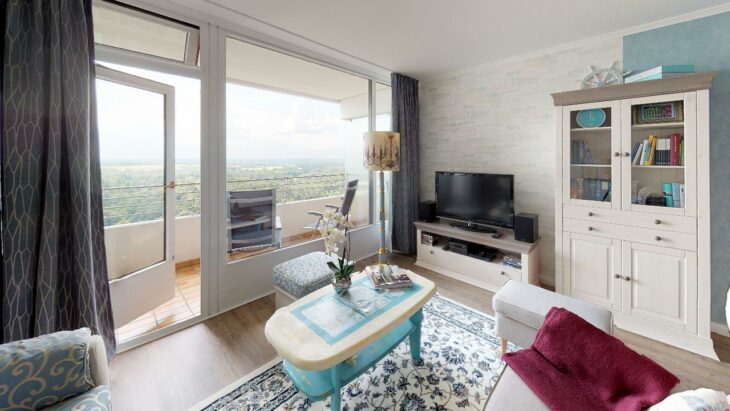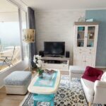 Bodentiefe Fenster im Wohnzimmer sorgen den ganzen Tag für eine helle und freundliche Atmosphäre. Von hier aus gelangt man auch auf den möblierten Balkon mit seitlichem Ostseeblick.