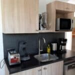 Der Bungalow verfügt über eine vollständig ausgestattete Küche (Gasherd, Mikrowelle, Mini-Backofen, Filterkaffeemaschine, Senseo-Pad-Maschine, Wasserkocher, Spülmaschine, Toaster, mannshohe Kühl-Gefrier-Kombi. Im Anbau steht auch eine Waschmaschine. Trocknen kann man zur Zeit nur mittels einer Wäschespinne im Garten.