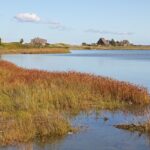 Blick über das Naturschutzgebiet auf die Ostsee und den Leuchtturm