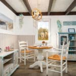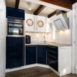 Eine hochwertige, gut durchdachte Kücheneinrichtung im maritimen Stil. Für die nächtliche Ruhe und erholsamen Schlaf sorgt das kuschelige Boxspringbett.