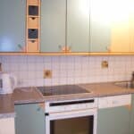 Küche ist mit Geschirr und Töpfen usw ausgestattet.