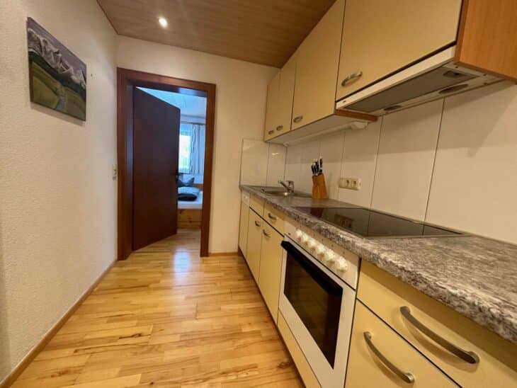 Eine gemütliche Ferienwohnung für 4 - 5 Personen mit Balkon in Richtung Grün. Küche ist voll ausgestattet.
