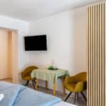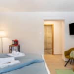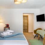 Doppelzimmer mit Kingsize Doppelbett, Bad mit Dusche und WC! Kleine Terrasse im Südosten des Gebäudes! Kaffeemaschine und Wasserkocher vorhanden!