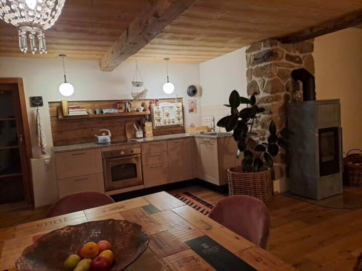 Eine vollausgestattete Landhaus Küche mit Arbeitsplatz vom Waldviertler Granit, E-Herd mit Backrohr, Geschirrspüler, Wasserkocher mit Teesortiment, Espressomaschine mit Kapseln, Salz & Pfeffer, Zucker…. Und ein Willkommenesgruß mit heimischen Schmankerln.