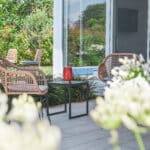 Großzügige Terrasse mit stylischen Gartenmöbeln zum gemütlichen Beisammensein.