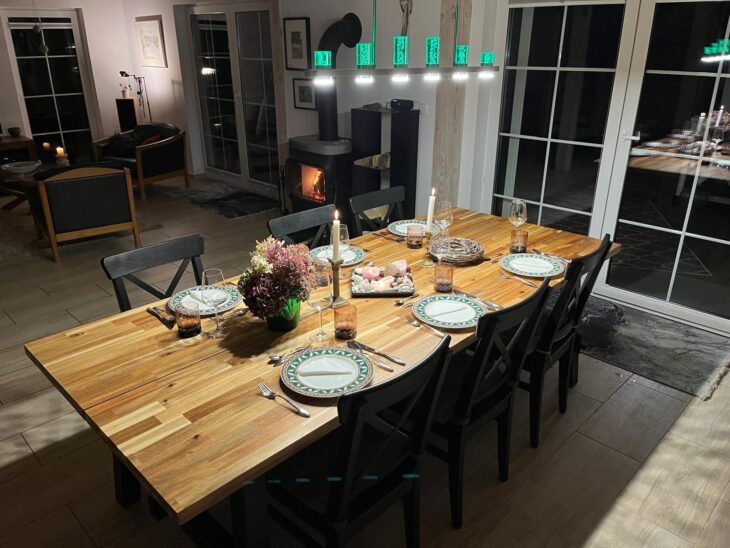 Ein Lagergrillplatz mit Feuerschale lässt Romantik aufkommen. Bei schönem Wetter können Sie am Garten am Außenesstisch Ihr Essen einnehmen oder auch an einem Esstisch auf der großen windgeschützten Terrasse.