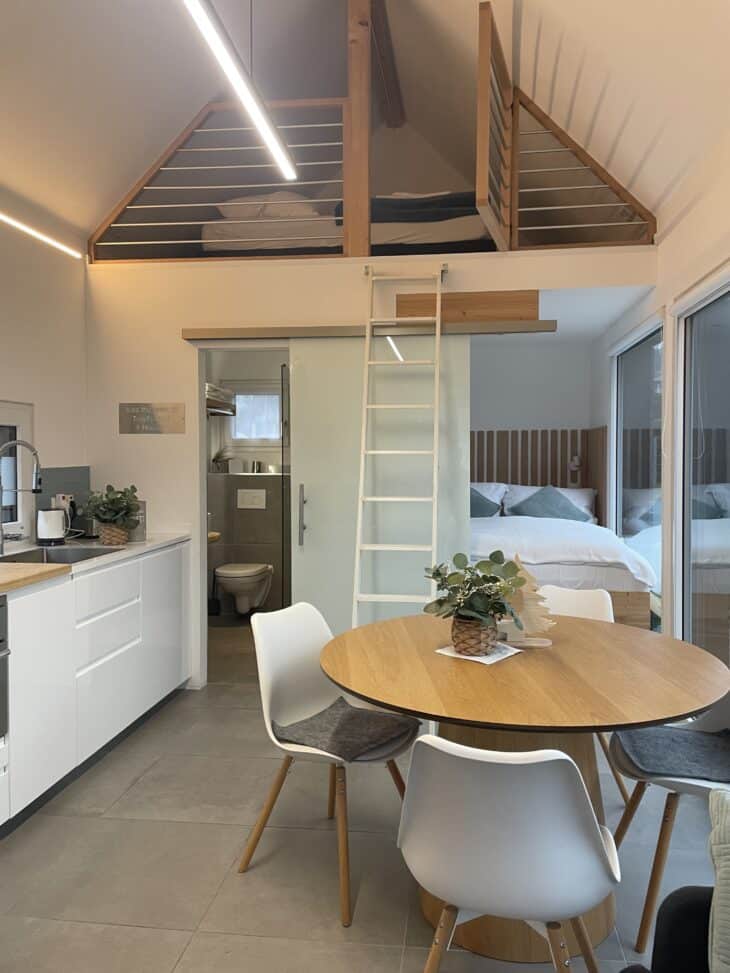 Das Tinyhaus ist trotz kompakter Größe sehr hochwertig ausgestattet und bietet alles, was man für einen erholsamen Aufenthalt braucht: gemütlicher Wohnbereich, voll ausgestattete Küche, bequemes Bett sowie eine Terrasse mit Blick ins Grüne.