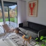 Das Haus besteht aus einem Wohnraum mit gemütlicher Sitzecke, sowie einer voll ausgestatteten Küchenzeile mit Esstisch und Stühlen. Das an die 2 Hauptschlafzimmer angrenzenden Bäder haben eine Toilette mit Waschbecken und großer ebener Dusche. Die Bäder sind ausgestattet mit Spiegel, Fön und Handtüchern. In den 2 Hauptschlafzimmern befinden sich neben einem Schrank ein fertig bezogenes Hotelbett von 1,60x2,0m welches in 2 Betten a 0,80x2,0m geteilt werden kann. Zusätzlich befindet sich auf einer Empore ein weiteres Bett von 1,40x2,0m. Die Einrichtung ist modern in schwarz/weiß mit roten Details eingerichtet und mit Accessoires und Bildern schön gestaltet. Auf der eigenen zur Hälfte überdachten Terrasse finden sich eine Sitzecke mit Tisch und Liegestühle, sowie ein Hängesessel. Der eigene nicht eingezäunte liebevoll gestaltete Garten mit Rasenfläche und Blumenrabatten lädt zum verweilen ein.