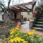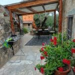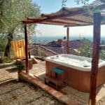 Auf der oberen befindet sich der Eingang mit Gästeparkplatz von der Straße zum Garten, eine Sitzecke unter einem schattenspendenden 300 Jahre alten Olivenbaum, ein Whirlpool und Sonnenliegen mit Beschattung.