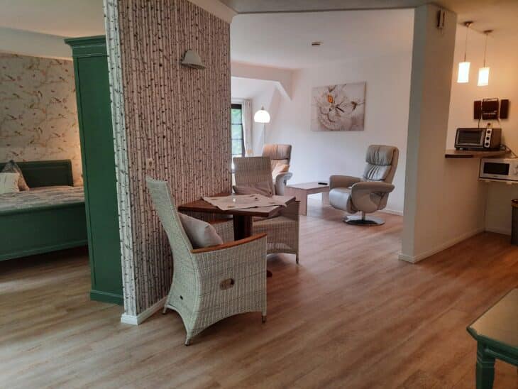 Die Lindenstube liegt in der 1. Etage, hat 3 Räume mit Esszimmer/Küche; Wohlfühlzimmer mit Dusche Badewanne, TV und Sono; Schlafzimmer mit TV, Vetilator und angrenzendem WC/Bidet