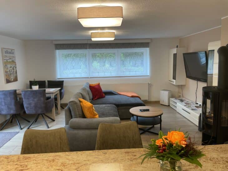 Es gibt eine schöne Terrasse mit Loungeecke im Garten, doch in der luxuriös ausgestatteten Souterrain-Ferienwohnung können Sie Ihre freie Zeit auch sehr gut drinnen genießen. Der gemütliche Wohnbereich mit Couch (ausziehbar zur Schlafcouch mit 150x200cm Liegefläche) und 50-Zoll-Fernseher geht in den offenen Küchen- und Essbereich über. An kalten Tagen werden Sie den Kaminofen lieben!