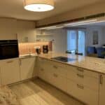 Die voll ausgestattete Küche lädt zum gemeinsamen Kochen und Backen ein. Sie finden neben Kühl- und Gefrierschrank einen Geschirrspüler, Backofen und ein Induktionskochfeld vor. Es gibt 4 Sitzplätze an der tiefen Marmor-Arbeitsplatte, entweder zum Essen oder zum Mitwirken und Zuschauen beim Kochen. Ein auf 160 cm ausziehbarer Esstisch mit weiteren 4 Stühlen ist ebenfalls vorhanden. Im zugehörigen Hauswirtschaftsraum gibt es einen Waschtrockner.