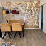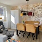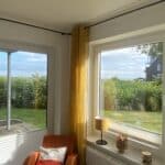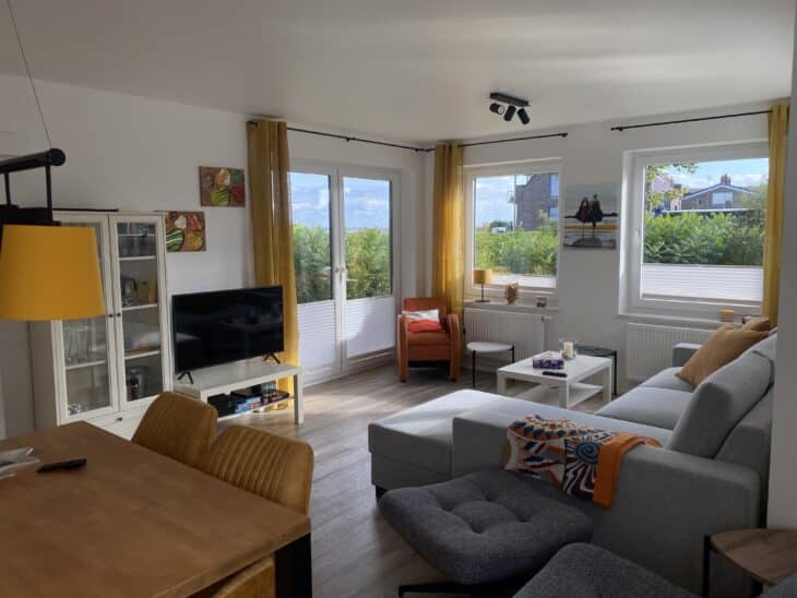 Der große, lichtdurchflutete Wohn- und Essbereich ist gemütlich ausgestattet und verfügt über eine Terrasse sowie Zugang zum Garten.