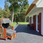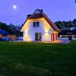 Dieses modern ausgestattete Ferienhaus mit traditionellem Reetdach und ca. 1600 m² großem Grundstück liegt am Ortsrand in Waldrandlage in einer kleinen Ferienhausanlage. Es bietet viel Platz für vier Feriengäste (zwei Schlafzimmer mit Doppelboxspringbett und TV) und verfügt über einen großzügigen Wohn-Essbereich, ein einladendes Bad mit Badewanne und bodengleicher Dusche, WC und Sauna im OG sowie ein Gäste-WC im EG.