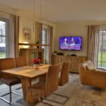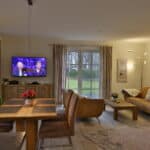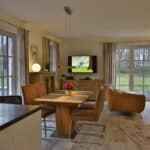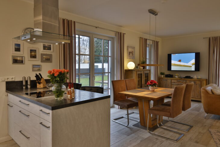 Im EG befindet sich ein ca. 36 qm großer Wohn-Essbereich mit gemütlicher Couch, Sesseln, Kaminofen, SAT-TV, PS4 und neben einer komplett ausgestatteten Küche ist ein Esstisch für 4 Personen vorhanden. Die Schlafzimmer sind mit Boxspringbetten und TV ausgestattet. Der vorhandene Strandkorb und Sonnenliegen laden zum Verweilen ein.