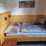 Duschbad und WC befinden sich zwischen diesen Räumen. Das Schlafzimmer ist mit Doppelbett, Nachtschränkchen und einer Sitzgelegenheit ausgestattet. Auf der gegenüberliegenden Seite befindet sich ein kleiner Schlafraum mit eingebautem Bett (1,40 m x 2,00m) und Kleiderschrank,