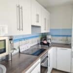 Die Küche liegt direkt neben dem Eingangsbereich und ist mit Backofen, Ceranfeld, Geschirrspüler und Kühl-Gefrier-Kombination ausgestattet.