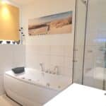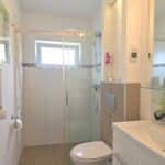 Beim großen Bad welches neben einer großzügigen Dusche auch über eine Whirlwanne verfügt, befindet sich auch der Zugang zum HWR mit Waschmaschine und Trockner. Das kleine Bad hat eine große ebenerdige Walk-In-Dusche mit Schiebetür.